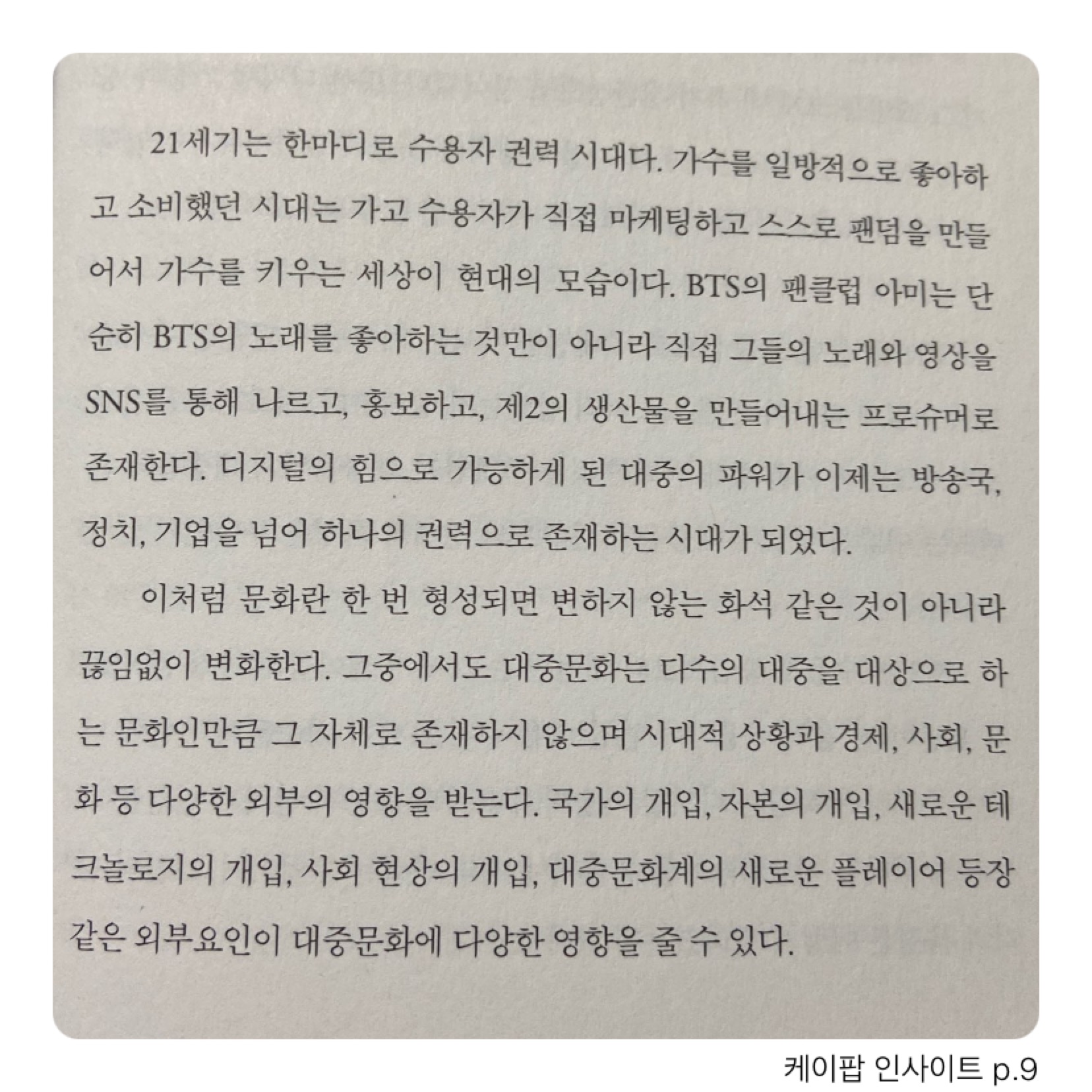 “스마트폰과 유튜브, sns로 대표되는 짧고 빠른 정보 수명과 소비자들의 능동적인 행동력, 활발한 쌍방향 소통 문화와 가벼운 재미와 유희를 추구하는 성격이 현재의 K-팝을 만들었고 그 소비 규모와 영향력을 키웠다”는 것이 이 책이 전하고자 하는 주 요지라 하겠다.